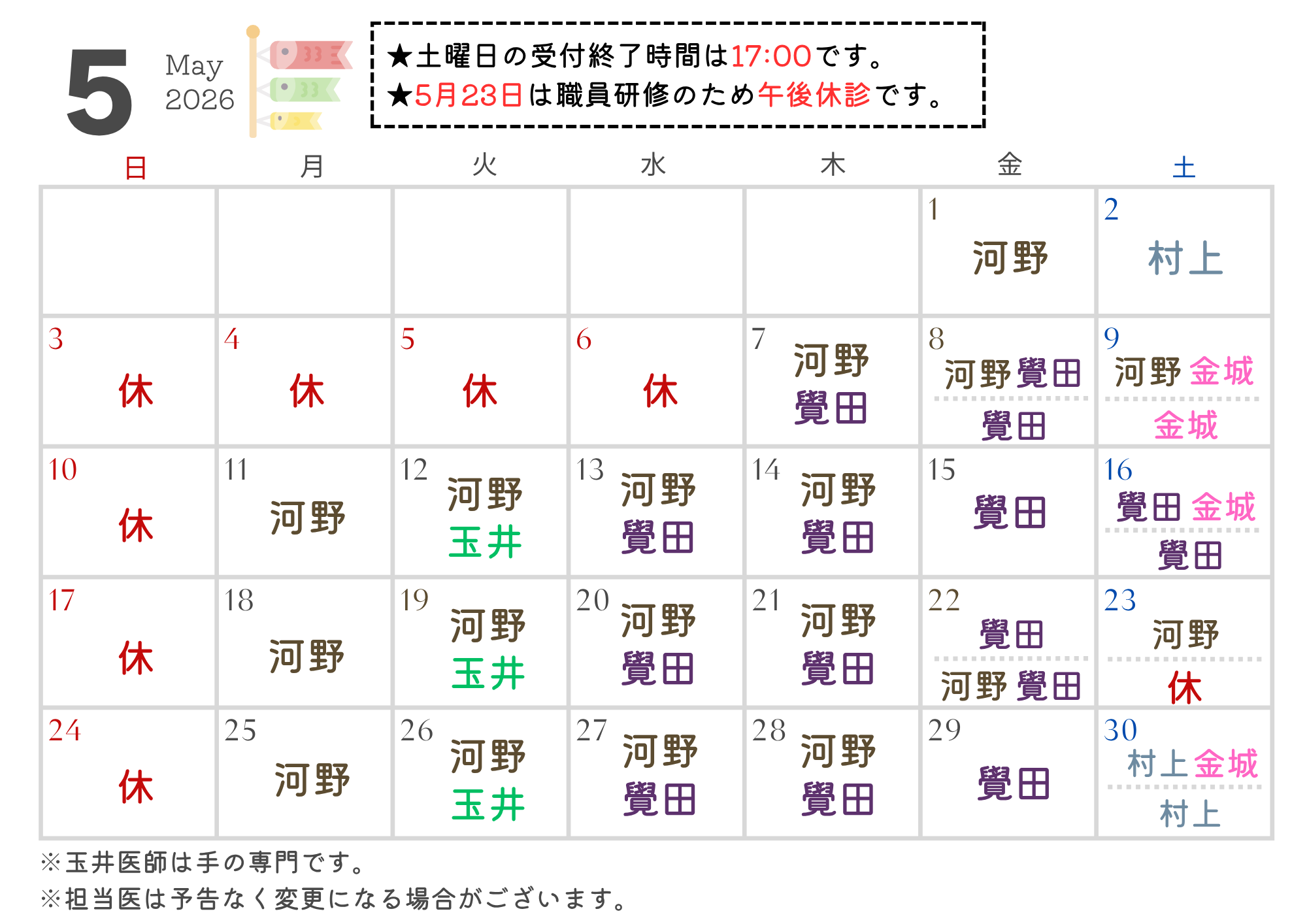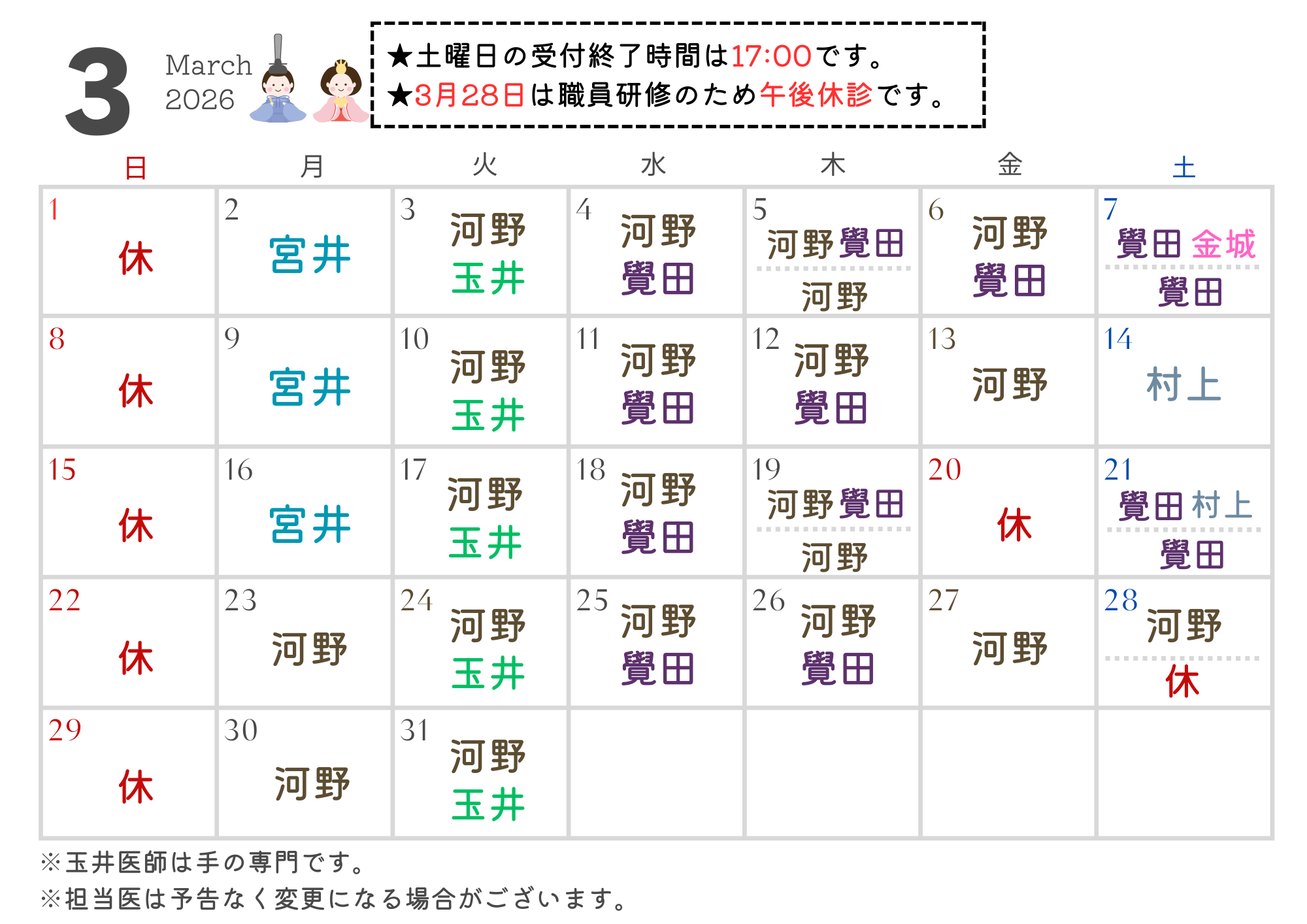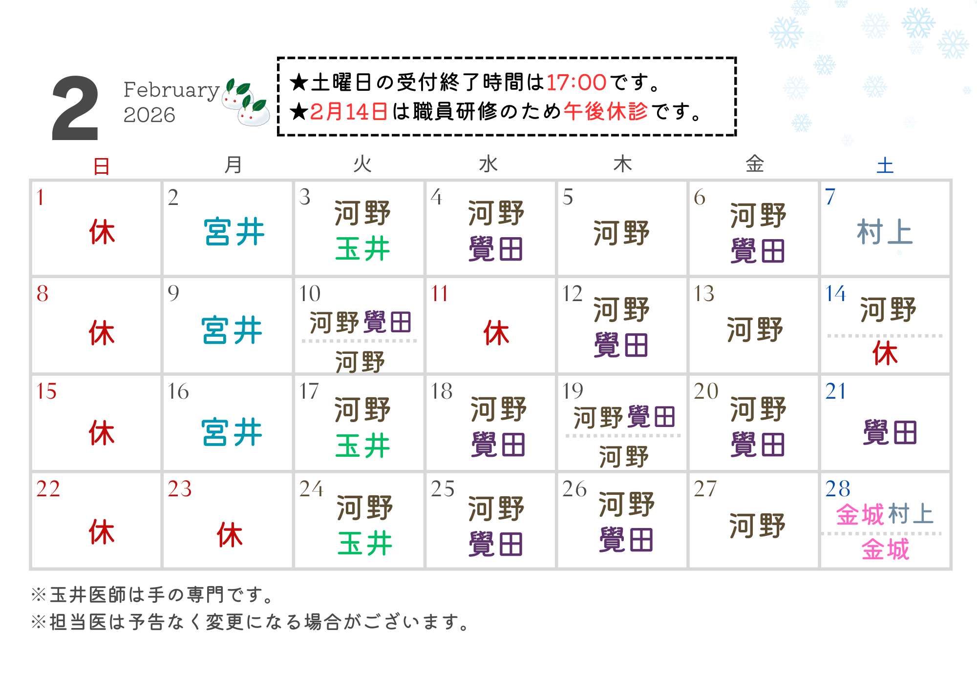毎週火曜日に診察を行っている玉井医師は、手の外科専門です。手や手首、指のしびれや痛み、腱鞘炎、ばね指、手根管症候群、手の骨折・変形など、手の疾患に幅広く対応しています。