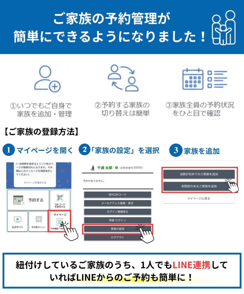 LINEまたは予約WEBサイトのマイページの「家族の設定」から簡単にご登録いただけます。