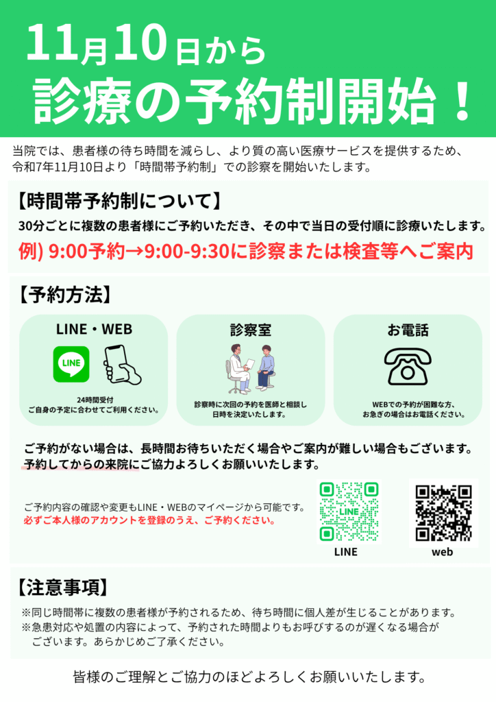 HOME > お知らせ > お知らせ 11月10日から診療の予約制を開始します。 2025年10月24日 LINE:https://lin.ee/pUGoLVu WEB:https://shinchitose.reserve.ne.jp/sp/index.php? 最新の投稿一覧 28.海外と日本の理学療法制度の違い 2025/10/24 整形外科 11月10日から診療の予約制を開始します。 2025/10/24 お知らせ 27.ロボット・AI技術と理学療法の未来 2025/10/23 整形外科 26.理学療法における最新のエビデンス・研究動向 2025/10/22 整形外科 25.地域での健康づくり教室と理学療法士の活動 2025/10/21 整形外科 -お知らせ